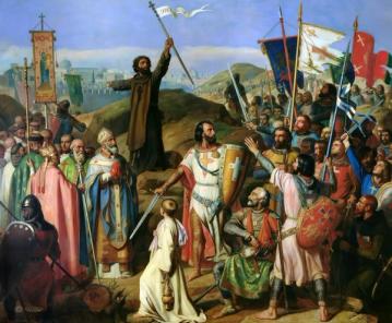 Pave Urban II kaller til krig mot muslimene i Jerusalem. Korstogene markerer en periode med intens fiendtlighet mellom kristne og muslimer, preget av religiøs demonisering og krigspropaganda.