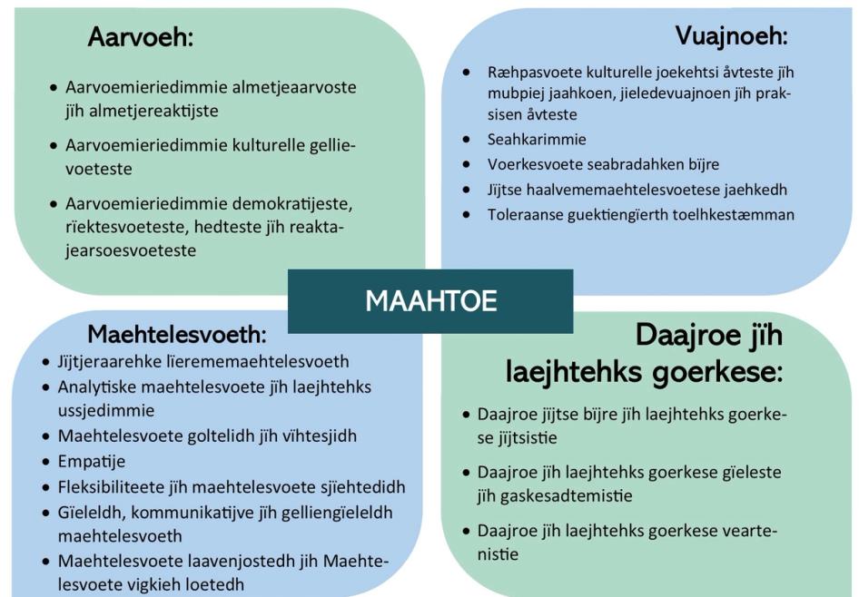 ektiedimmiem tjïerteste demokratijen jïh feerhmemen gaskem, dovne dan såarhts maahtoen bïjre mij lea daerpies gosse meatan demokratijesne, jïh ektesne jieledh kulturelle gellielaaketje seabradahkesne. Dam seamma aaj tjïerteste Europaraerien maahtoemierievierhkesne «Competences for Democratic Culture”. Vihth daate ellies geatskanimmien vööste tjuvtjede gusnie abpe skuvle sjædta goh demokrateles lïereme- jïh ektiedahkoekonteekste mij ektede lïereme bïjre, tjïrrh jïh åvteste.